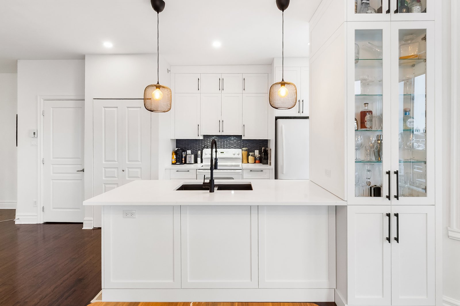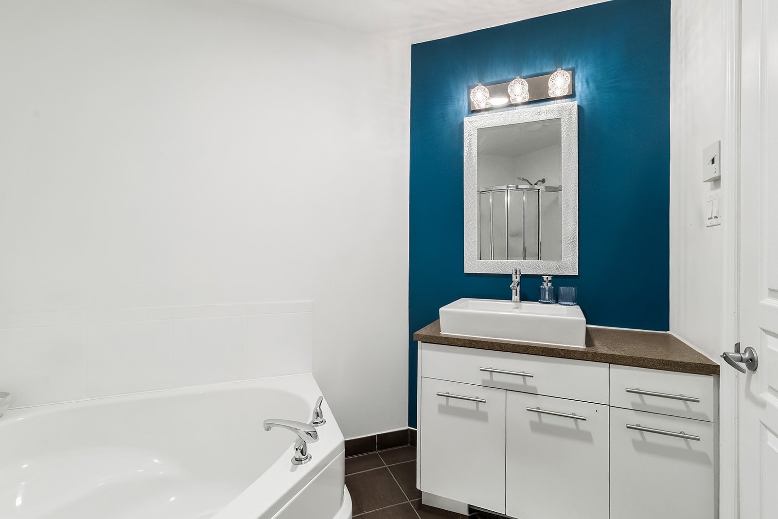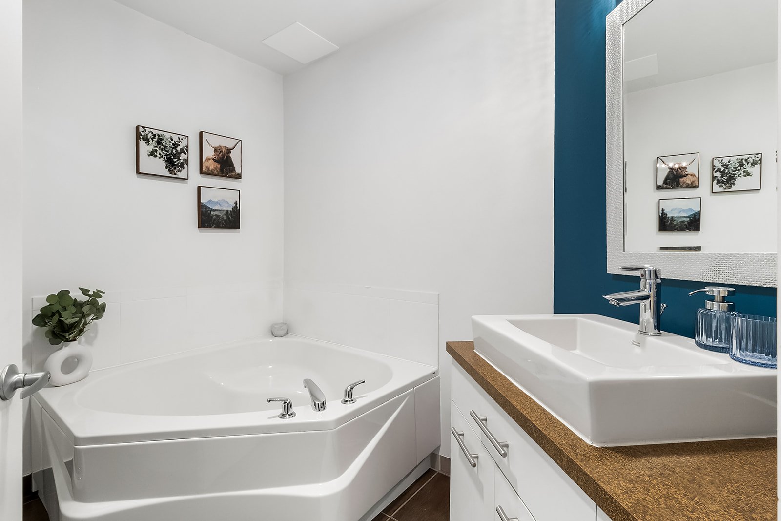 clean white walls accented with colorful feature walls that