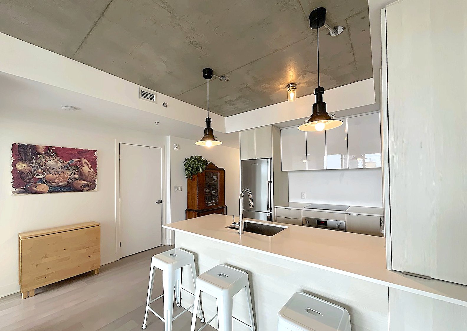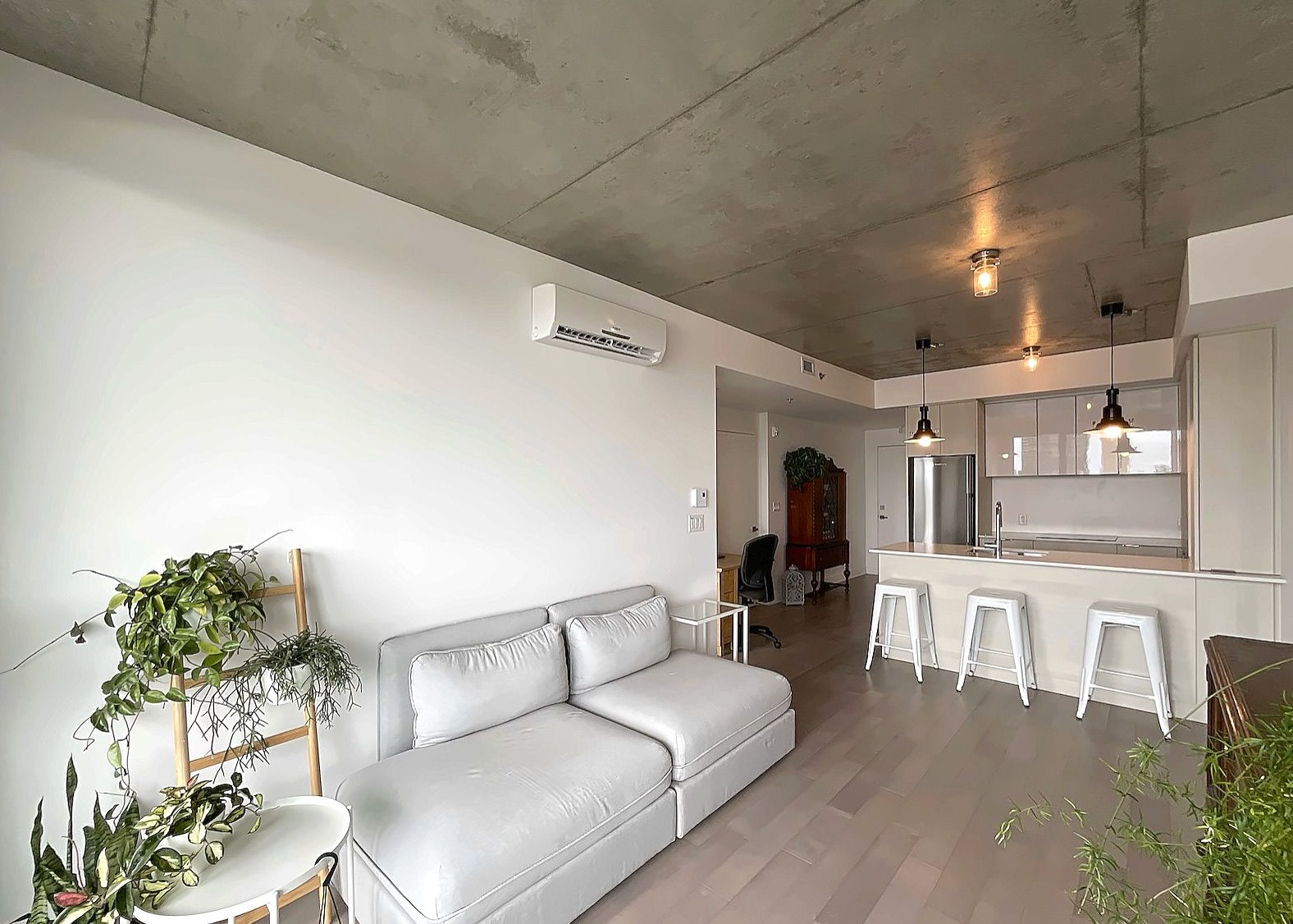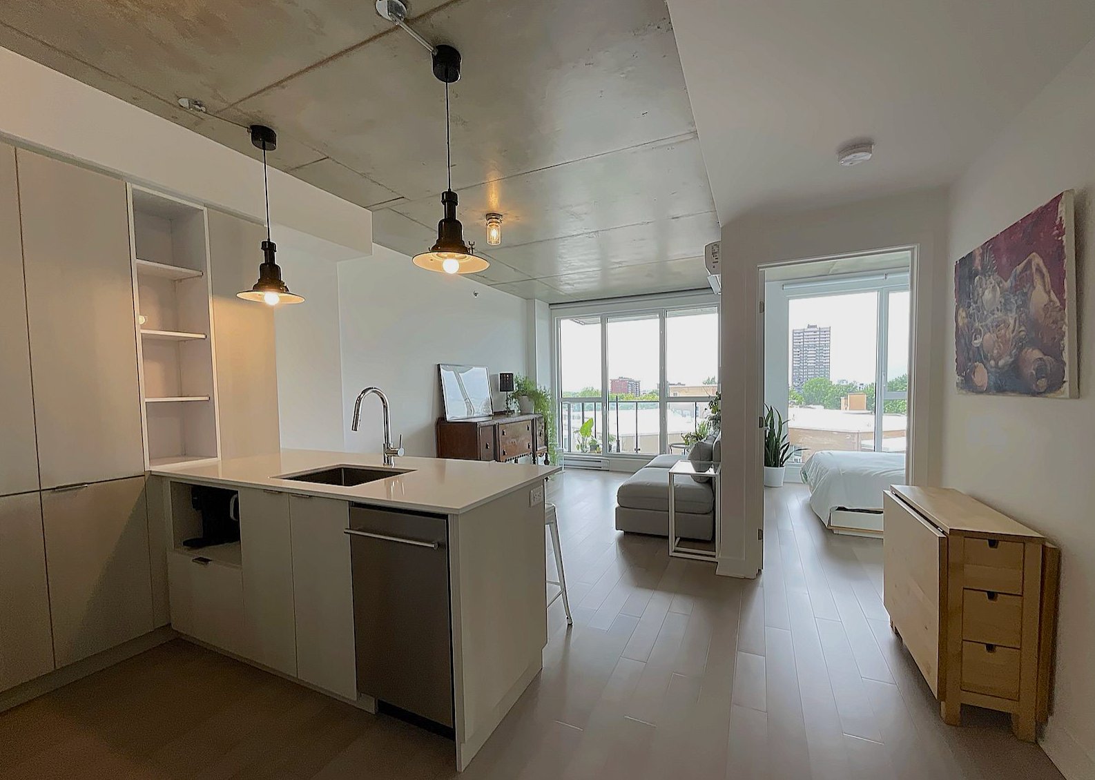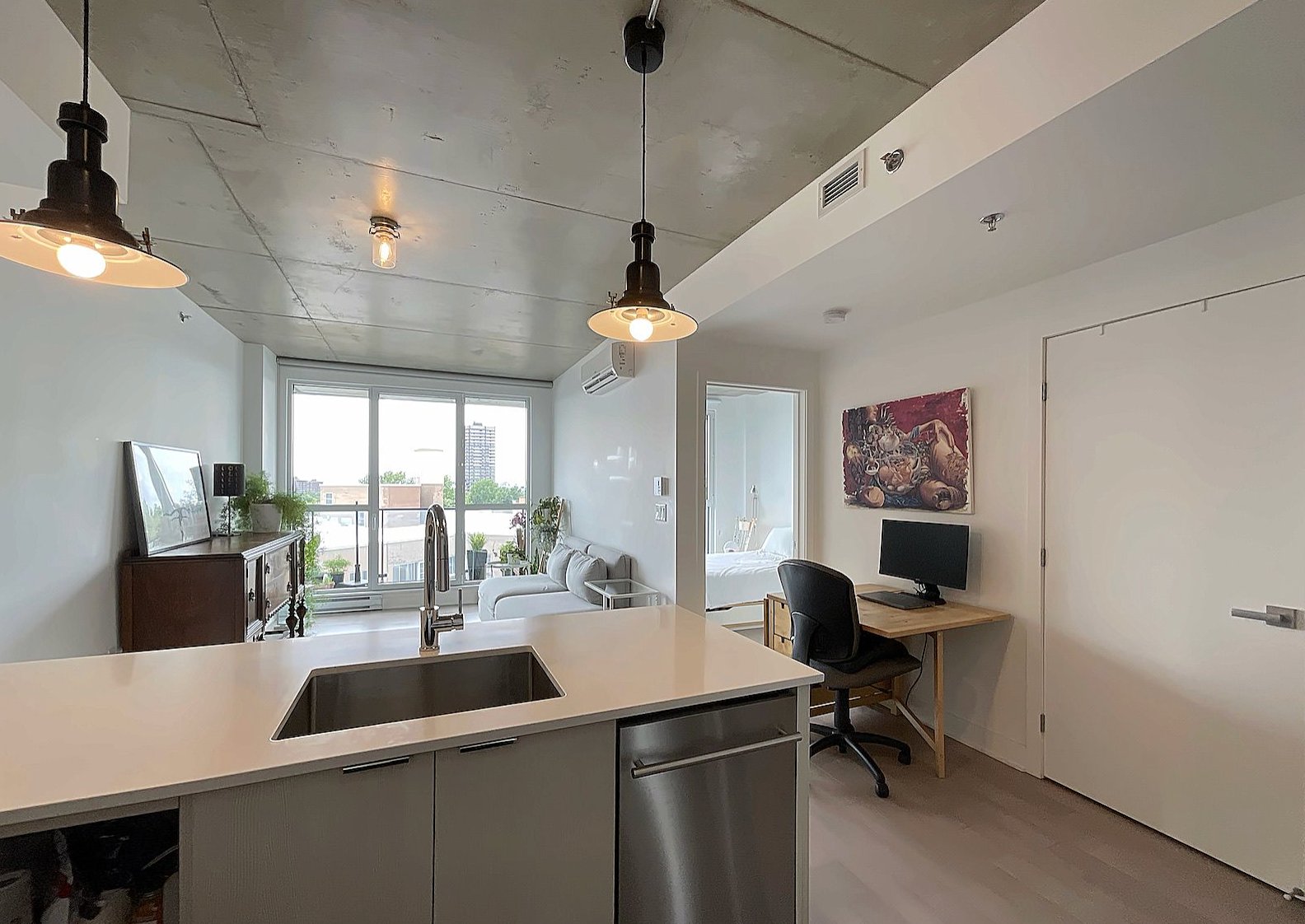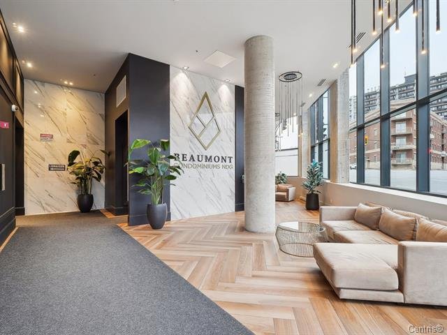 Bright modern condo in Le Beaumont NDG, impeccably maintained and owner-occupied only. Features 8'8" ceilings, closed bedroom with large closet, quartz kitchen, engineered hardwood floors, abundant natural light, private balcony with great unobstructed views, and big storage space. Built in 2019, the building offers a heated rooftop pool with terrace and fireplace, full gym, bike storage, security, and direct elevator access to IGA. Pet-friendly. Prime location 5 min from Villa-Maria Metro, Décarie, downtown, UdeM, HEC, shops, parks, and services. Available immediately.