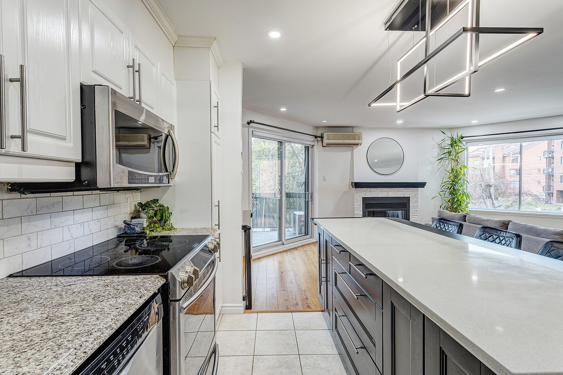 9420 Rue Cérès, apt#102 Spacious 2-bedroom condo in Pierrefonds-Roxboro, located near the Sunnybrooke REM station, Parc-nature du Bois-de-Liesse and Highways 13 and 40. Open-concept layout offering a bright living room with a fireplace and balcony access, adjacent to a functional kitchen. Two generously sized bedrooms provide comfort and flexibility. Large bathroom featuring both a bathtub and a separate shower. The unit also includes an indoor garage space.